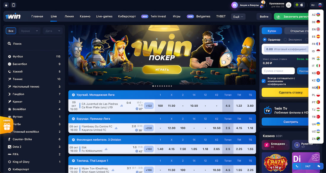 Если у вас нет своего промокода, загляните в интернет — там часто делятся рабочими комбинациями. Но проверяйте, чтобы код был актуальным. После регистрации начинается самое интересное. Теперь вам доступна вся букмекерская контора 1вин: